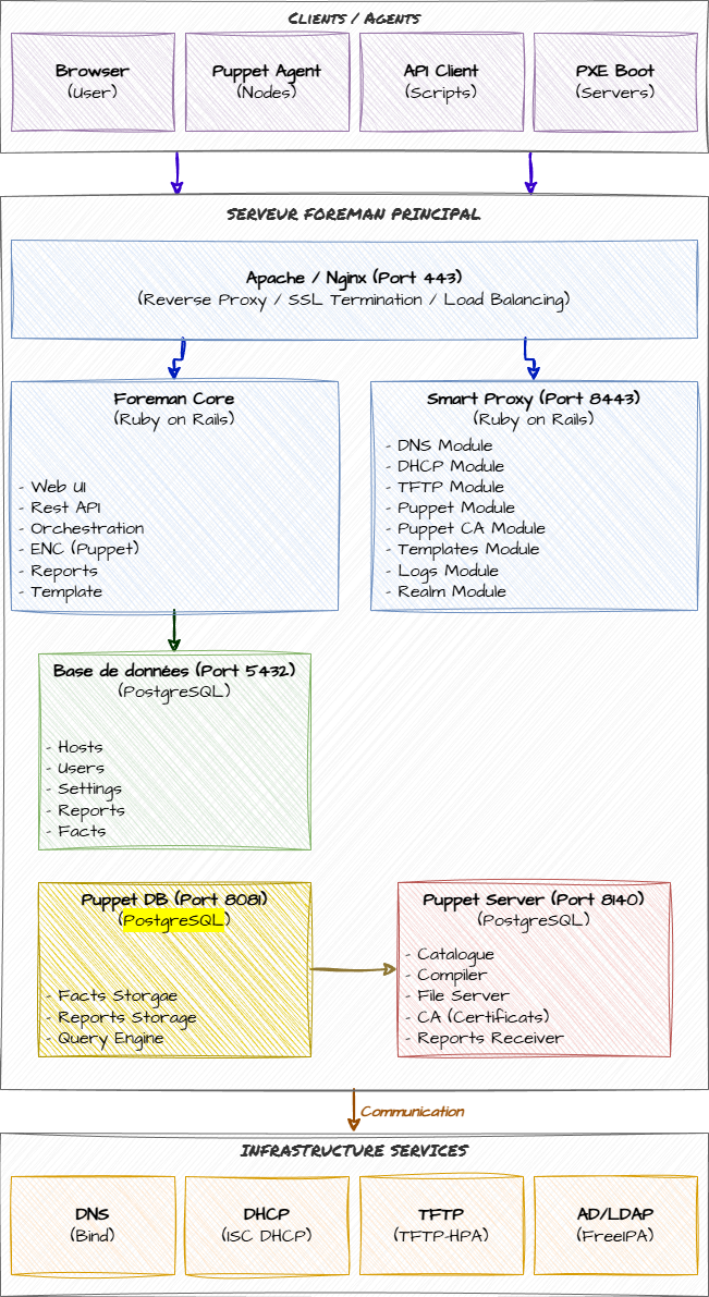 Accès WebUI:Browser → HAProxy:443 (HTTPS) → Foreman:80 (HTTP) → Rails App → PostgreSQLAgent Puppet - Catalogue:Agent → HAProxy:8140 (mTLS) → Puppet:8140 → Foreman ENC → Compile → AgentAgent Puppet - Rapport:Agent → Puppet:8140 → PuppetDB:8081 → Foreman (webhook/API)Provisioning PXE:Server → DHCP → TFTP → Smart Proxy → Foreman (template) → InstallerOrchestration DNS/DHCP:Foreman → Smart Proxy:8443 → DNS/DHCP services